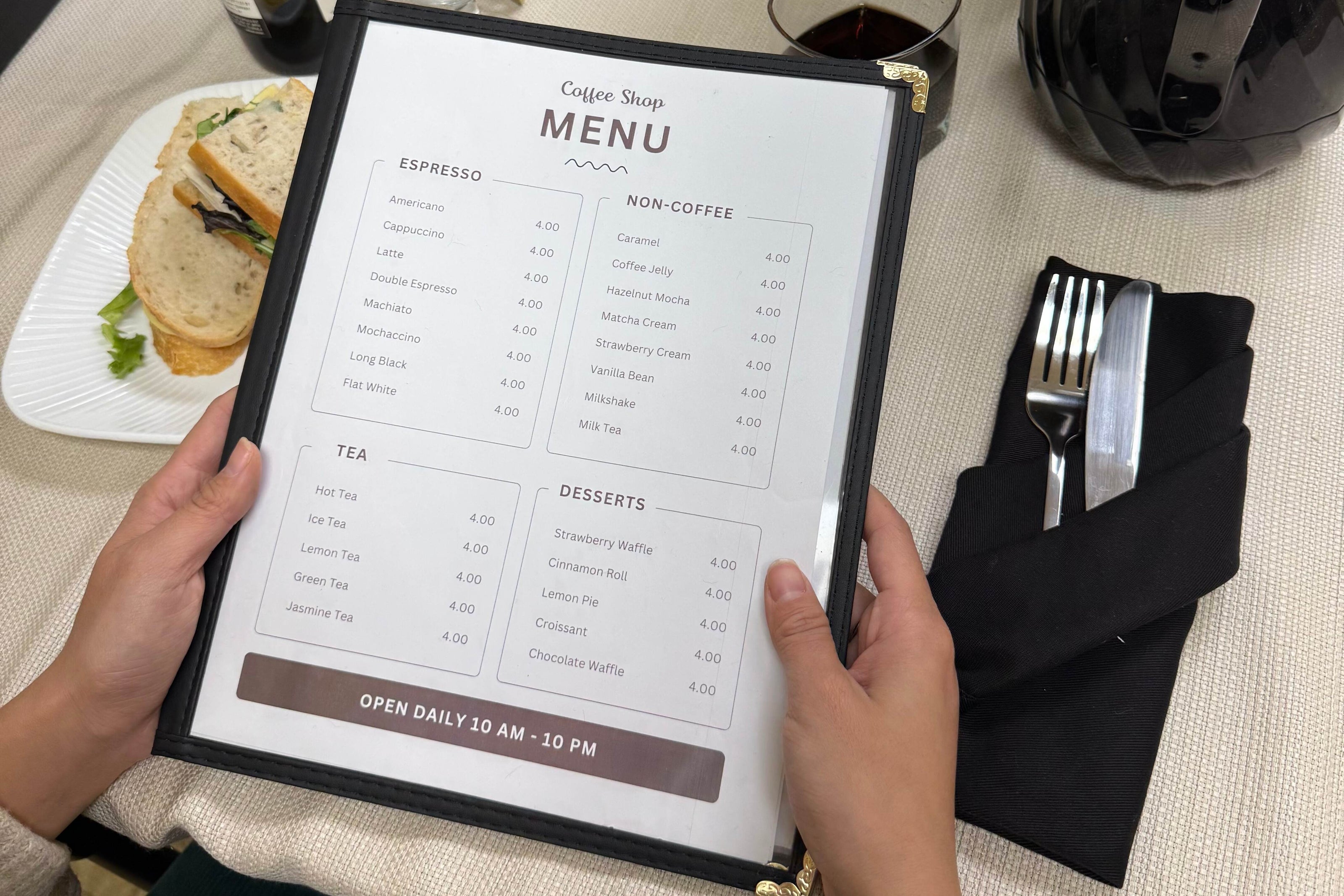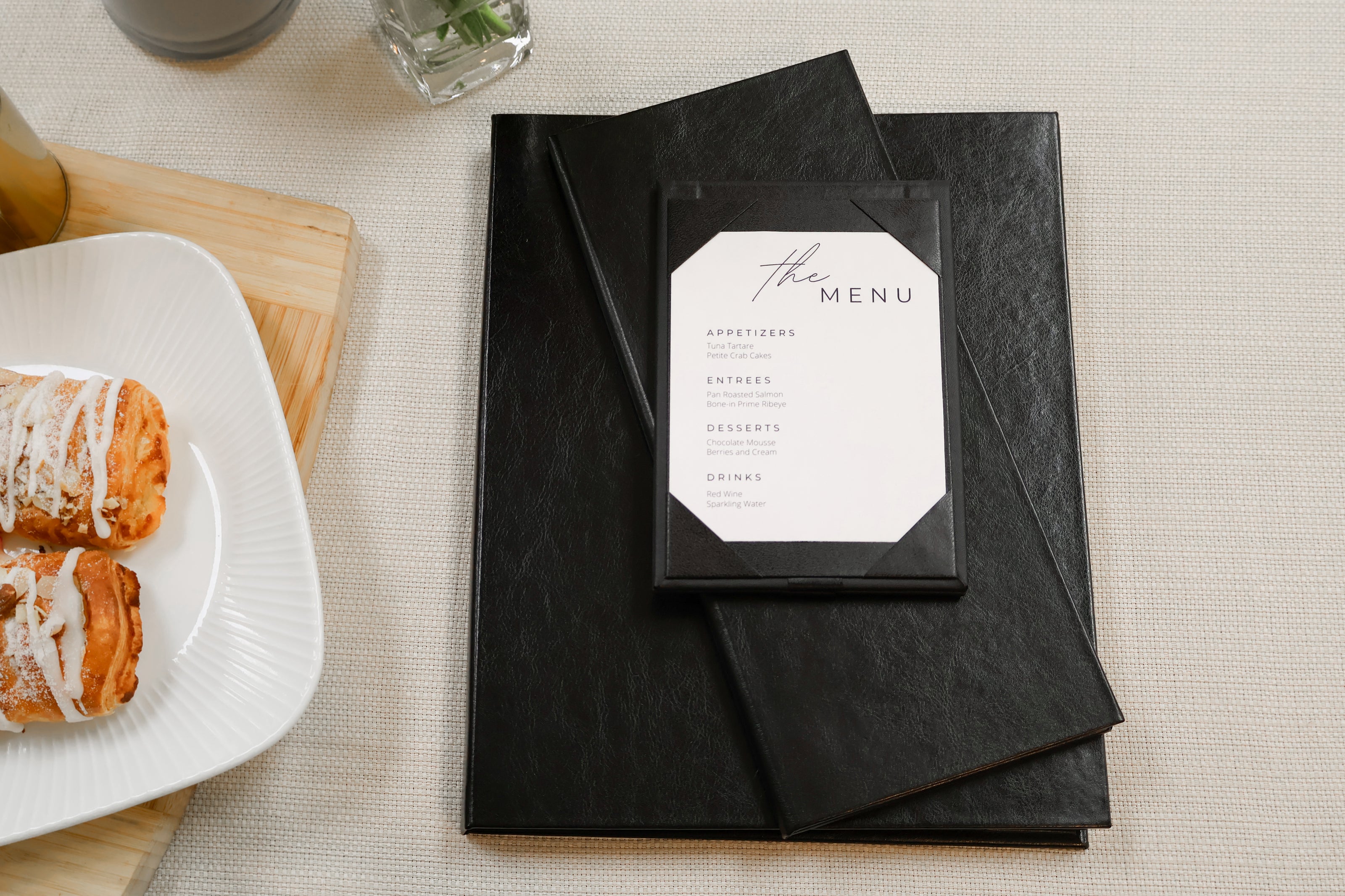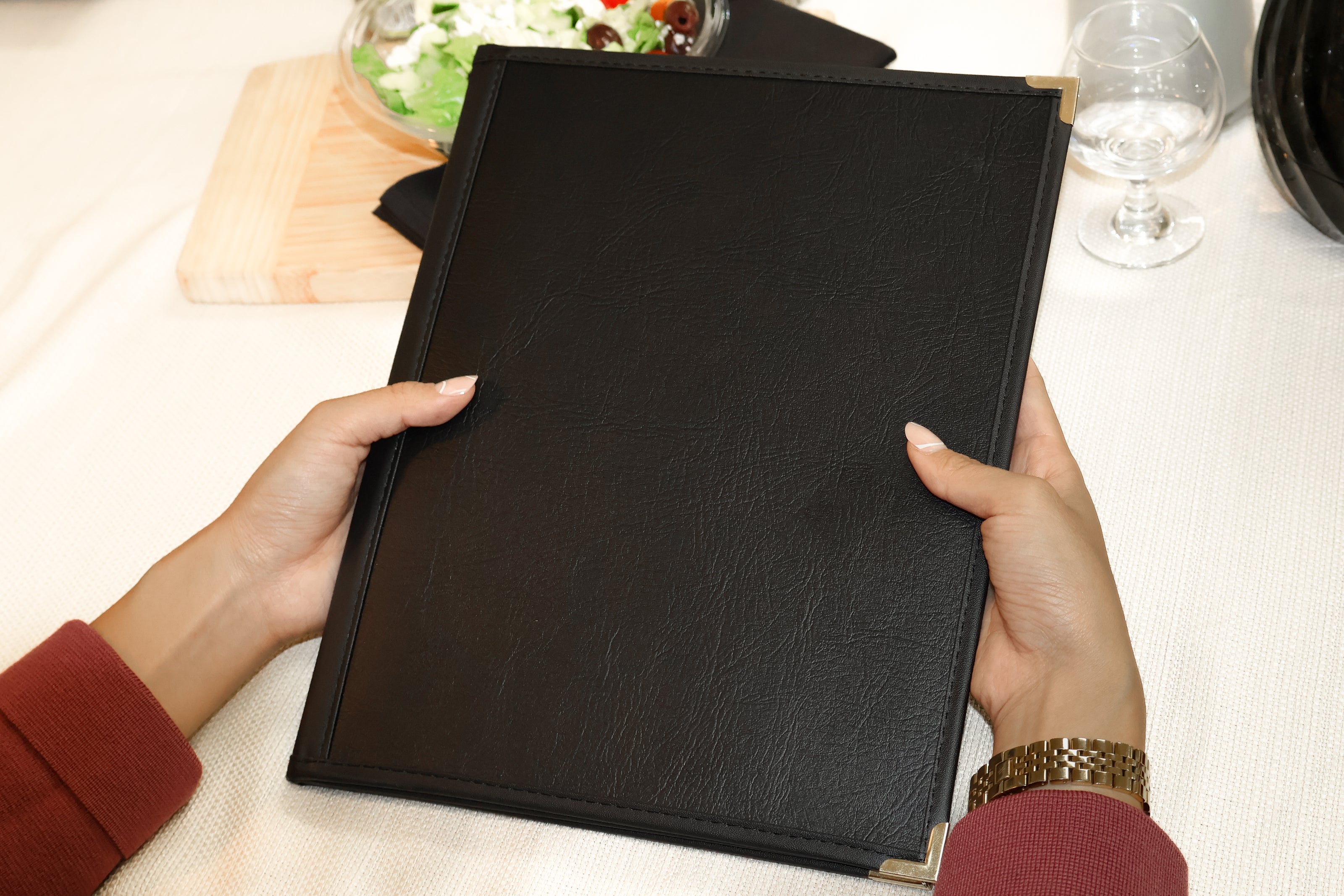We offer a large variety of standard menu cover sizes, ranging from 4"x6" table-tents, to 8.5"x14" large booklet menu covers. Most products come in multiple sizes - click onto a product to see the sizing options available.