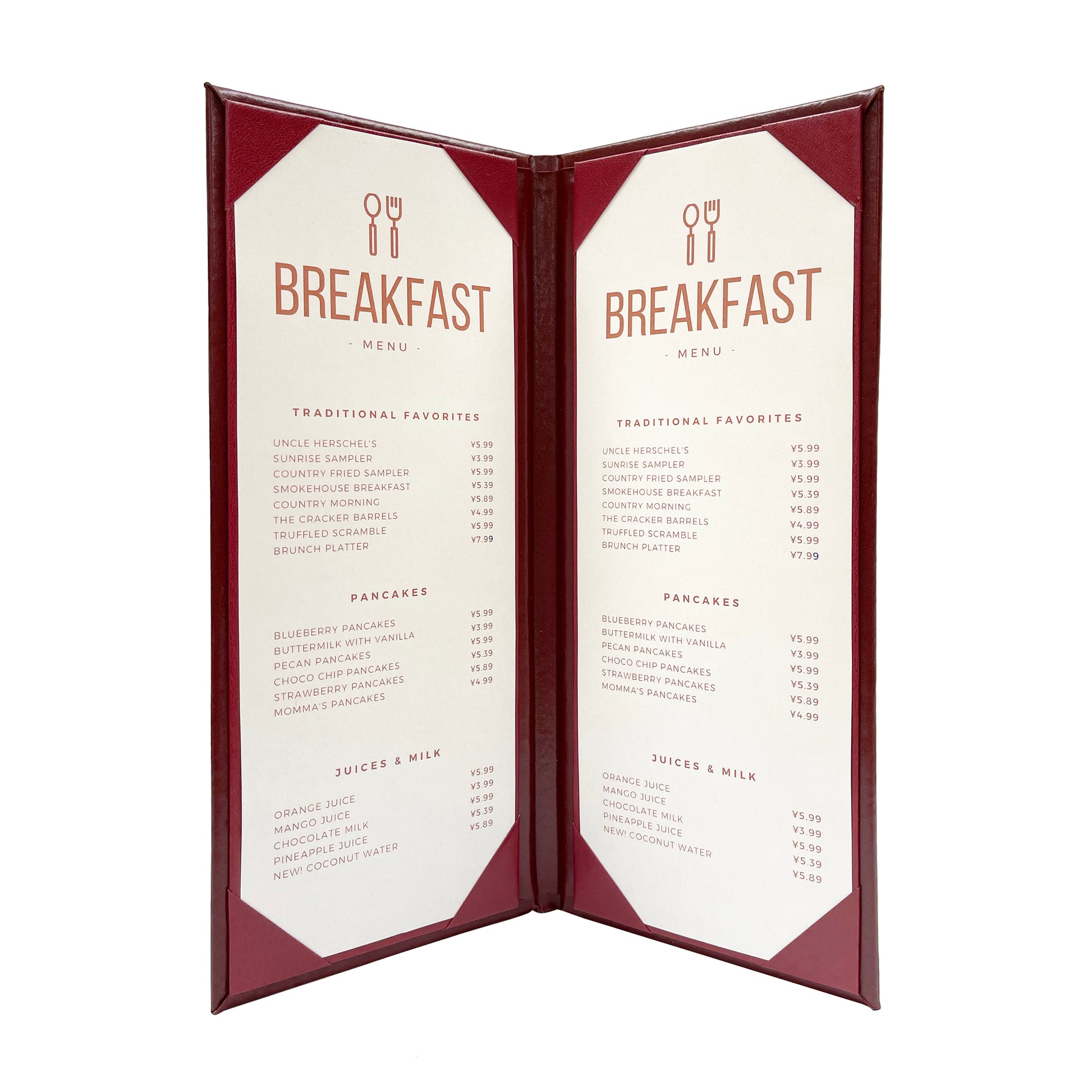 This Executive 2 View Menu Cover comes in black and burgundy with four size options, giving you the flexibility to match everything from compact drinks lists to slightly longer food menus. The two-panel layout keeps your content focused and tidy, making this a go-to menu holder where you want a clean, minimal format that still feels high-end.