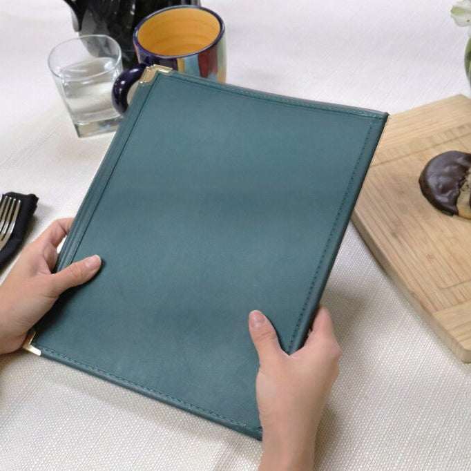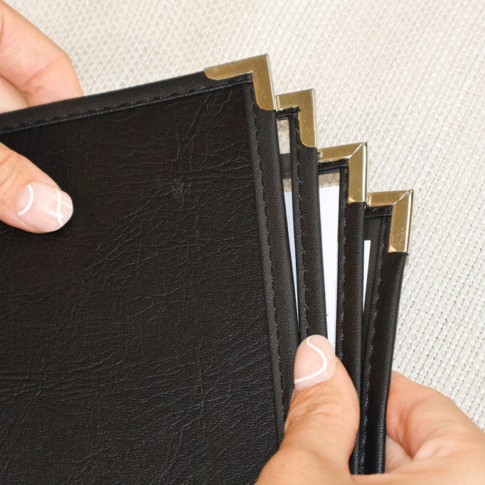 Built with a sleek leatherette trim and scratch-resistant vinyl panels reinforced with strong stitching, this restaurant menu cover is engineered for long-term use in professional hospitality settings. The four-view layout gives guests a natural flow through your menu, while clear vinyl panels and neat edges help every plastic menu sleeve stay sharp and easy to clean. It is a practical, everyday menu holder that still feels premium on the table.